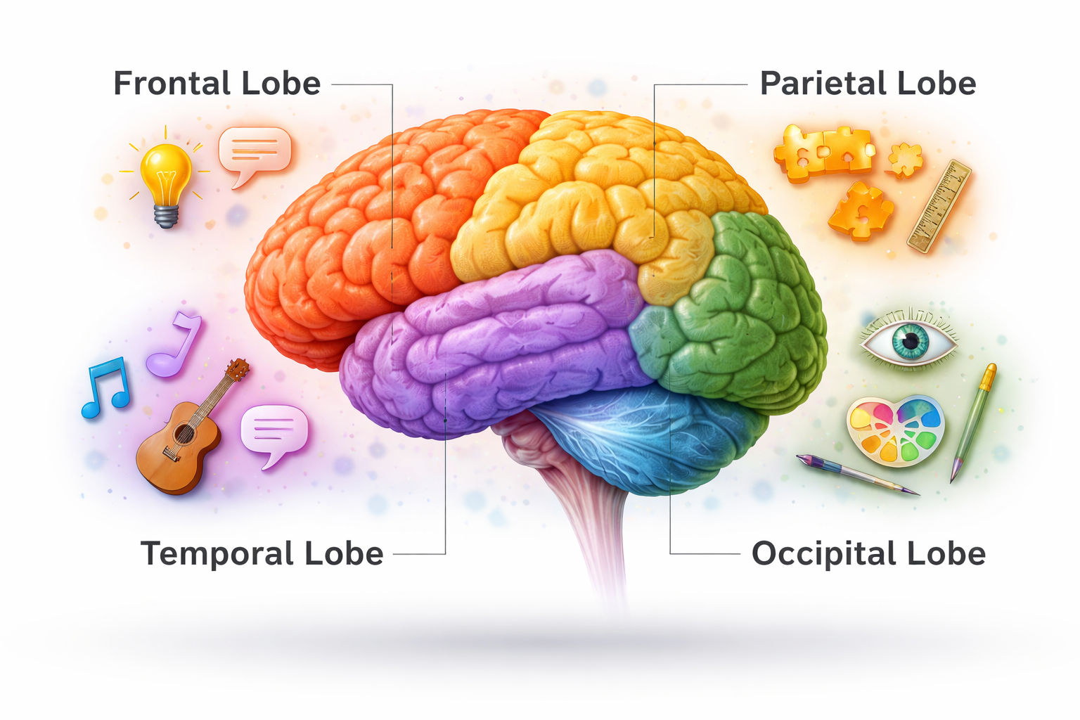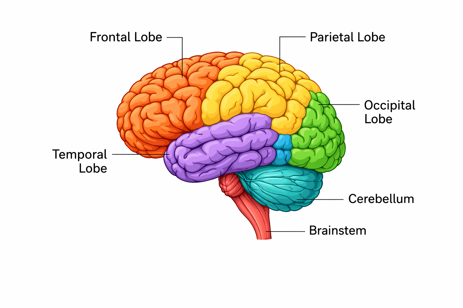 Used for accessible explanations of major brain regions, lobes, and inner brain structures.