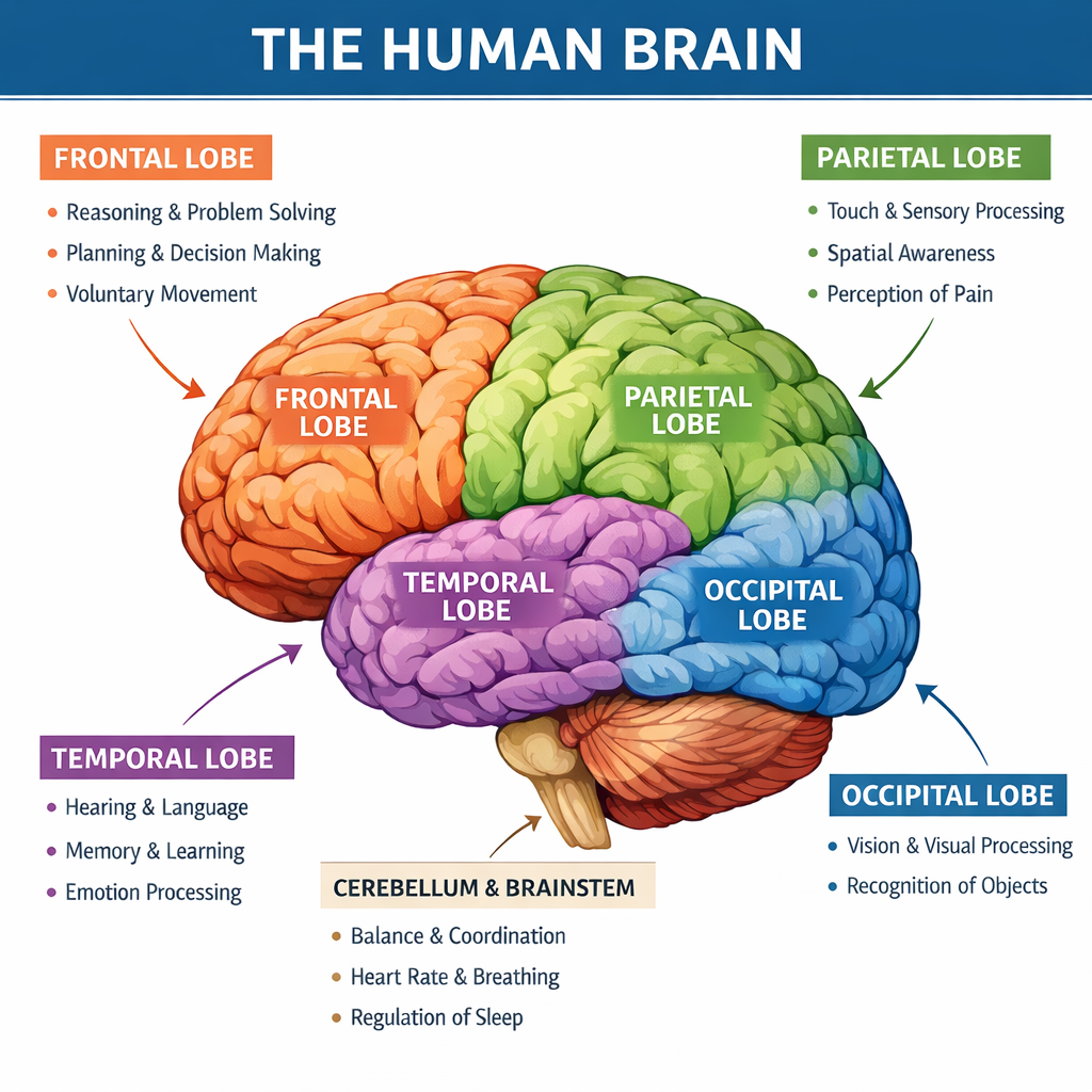 The brain is often described as three major regions working together as a single control system. The cerebrum handles conscious thought, sensory interpretation, language, planning, and voluntary movement. The cerebellum fine-tunes movement, timing, balance, and motor learning. The brainstem links the brain and spinal cord while regulating life-sustaining functions such as breathing, heart rate, blood pressure, and sleep-wake cycles.