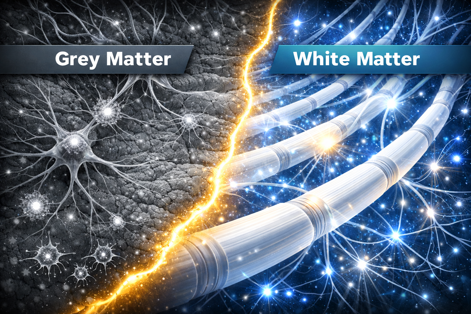 - You can think of grey matter as the brain's local processing hubs and white matter as the long-range wiring that lets those hubs communicate.